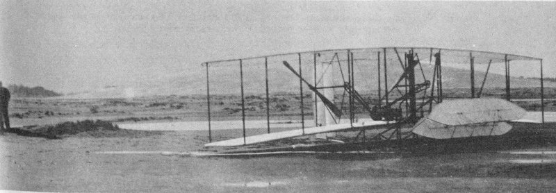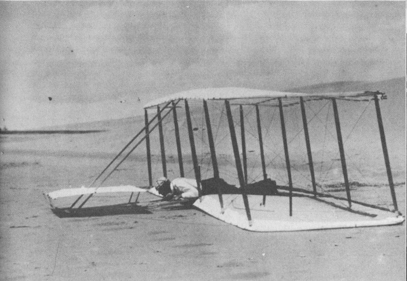 Close-up of 1903 machine at end of last flight, rudder frame broken in landing. Courtesy, Smithsonian Institution.