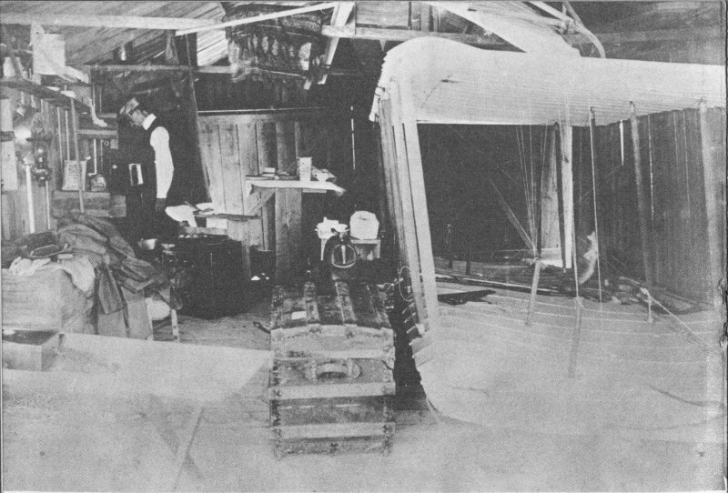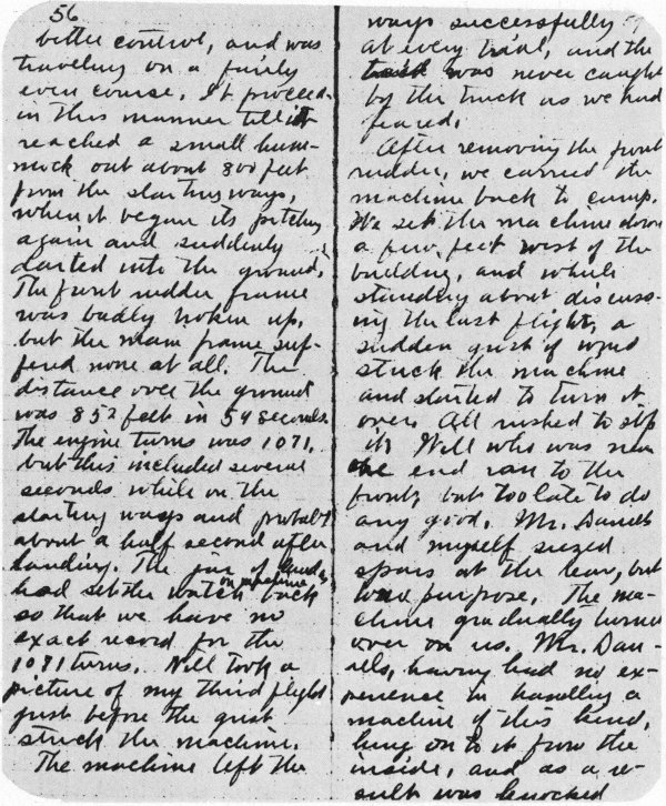 They carried the airplane back to camp and set it up a few feet west of the hangar. While the Wrights and onlookers were discussing the flights, a sudden gust of wind struck the plane and turned it over a number of times, damaging it badly. The airplane could not be repaired in time for any more flights that year; indeed, it was never flown again. Daniels gained the dubious honor of becoming the first airplane casualty when he was slightly scratched and bruised while caught inside the machine between the wings in an 52 attempt to stop the plane as it rolled over. Subsequent events were vivid in Daniels’ mind while reminiscing of his “first—and God help me—my last flight.” He relates: