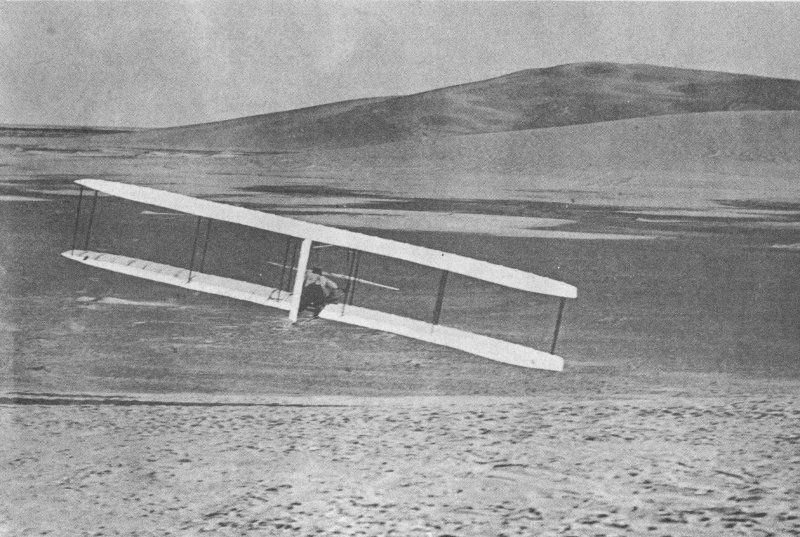 At 11:40 a.m., Orville made the third flight, flying a steadier course than that of the two previous flights. All was going nicely when a sudden gust of wind from the side lifted the airplane higher by 12 to 15 feet, turning it sidewise in an alarming manner. With the plane flying sidewise, Orville warped the wingtips to recover lateral balance, and pointed the plane down to land as quickly as possible. The new lateral control was more effective than he had 49 expected. The plane not only leveled off, but the wing that had been high dropped more than he had intended, and it struck the ground shortly before the plane landed. The third flight was about 200 feet in about 15 seconds.