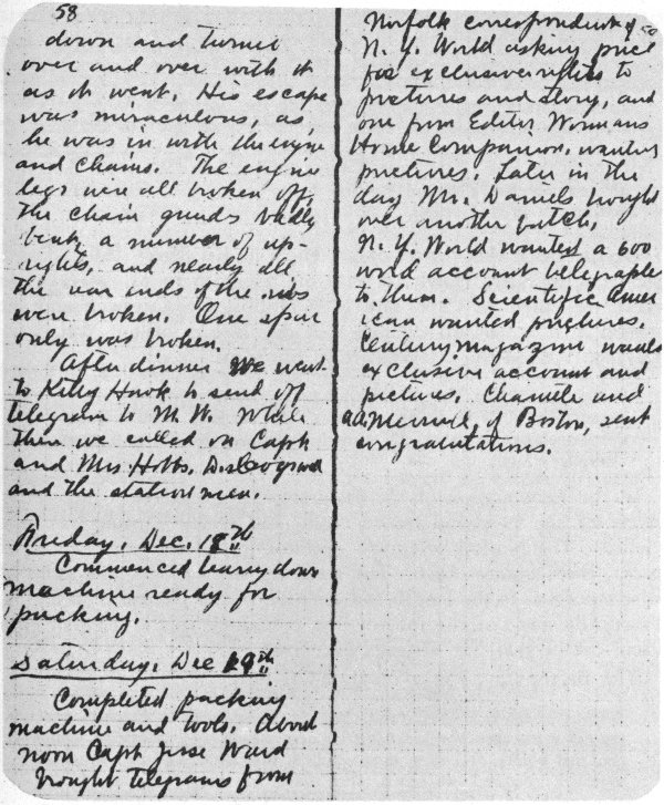 In the transmission of the telegram, 57 seconds was incorrectly given for the 59-second record flight, and Orville’s name was misspelled. The Norfolk telegraph operator leaked the news to a local paper, the Virginian-Pilot. The resulting story produced a series of false reports as to the length and duration of the December 17 flights. Practically none of the information contained in the telegram was used, except that the Wrights had flown.