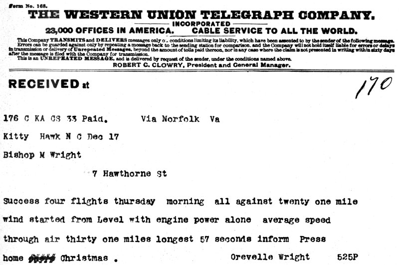 Orville Wright wired his father to announce the successful flights of Dec. 17, 1903.