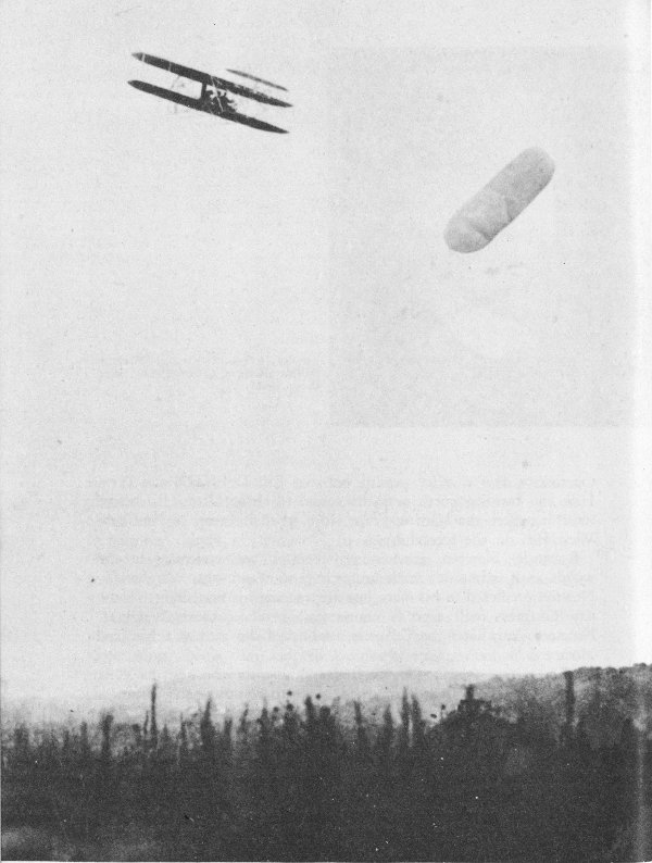 Orville and his passenger, Lt. Benjamin D. Foulois, round the captive balloon which marked the turning point of the Army speed test flight from Fort Meyer, July 30, 1909. The flight was just under 43 miles an hour. Courtesy, Smithsonian Institution.