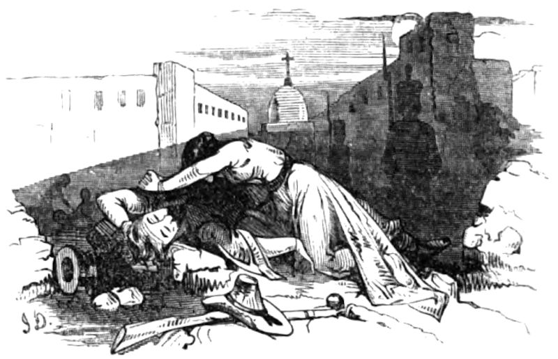 The crisis which followed the accession of Louis Philippe, did not overthrow the establishment, but it affected the school, and Salaville was dismissed with those who were not actually needed. Once in a while he would come in to inquire after the prospect of work; and when we would ironically congratulate him on his love for study, without reply he would throw off, with two or three strokes of the crayon, ludicrous sketchy caricatures. We accused him to ourselves of idleness, and thought him good for nothing, because he did not spend his days as we did daubing crooked palms, which we modestly called compositions, simpletons that we were. Without any apparent labor, as it were from the instinct that draws the bee to the rose, or the plant to the sun, he would sketch with boyish glee bits of exquisite designs—in one place a smoky hut, over whose broken, ruined roof the ivy gracefully twined; in another a noisy mill, surrounded with the sweeping foliage of the willow’s weaving branches; here and there clusters of drooping, bell-shaped flowers and wild jonquils twining together in luxuriant confusion; then in another corner of the paper a group of laughing, half-naked children, playing with one of those huge, long-eared dogs that the amiable Winterhalter calls the “First Friend!”