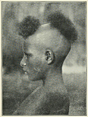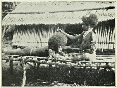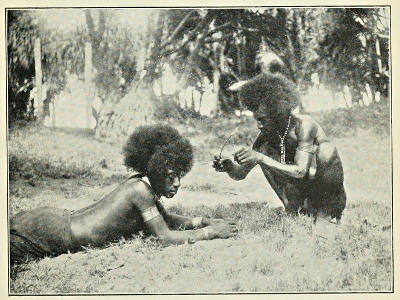 For most ailments the Papuan uses the old-fashioned remedy of bleeding. All sorts of pains in all parts of the body are supposed to be relieved by blood-letting, and the operation was usually performed by slightly cutting the skin with a shell, but now they have taken a step in advance and use a piece of glass. For headache, however, another instrument is used. Tima had been walking in the sun all[182] day, and said his head ached, and Aisi acted doctor. He made a little bow and arrow, tipping the latter with a fragment of glass, and then, at very close quarters so that he did not miss his mark, nor lose hold of his arrow, he repeatedly fired at Tima’s forehead. In this case not much blood was lost, but I have heard of cases where half a pint has been withdrawn before the cure was considered complete.