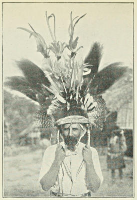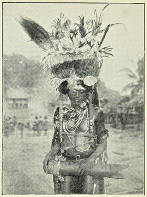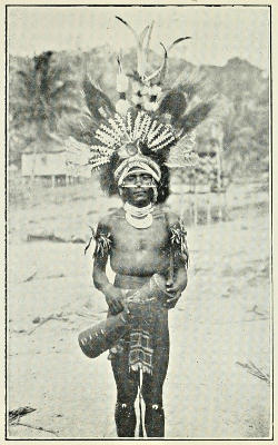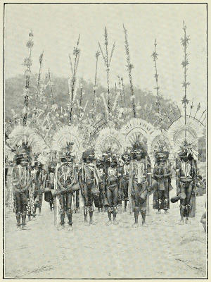 The procession that was then formed would have been the making of a Lord Mayor’s Show. The three white men, though evidently the centre of attraction, were very insignificant in their helmets and soiled white clothes, but the natives more than made up what was lacking by their display of paint, feathers and bright-coloured crotons, and the martial element was supplied by the bows and arrows and clubs. The parrot house at the Zoo would be peace itself compared with Moviavi at that hour.