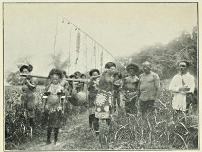 First went Tamate with a native holding[166] each hand, and closely followed by the man who had turned light porter and taken his bag from the boat. Walker was escorted by two more men, and his bag and umbrella proudly carried behind him. Donisi came next, and behind him his traps, and all around a shouting, surging mass of natives. In this way we were conducted to a shaded platform and there presented with fine new young cocoanuts to drink, while the people crowded round and examined us and our belongings, and no doubt expressed their opinions very freely, only we could not understand them. Tamate was presented with a pig, but as it was small, and there was no time for killing and eating it then, it was earmarked by cutting a hole in its ear and tying a strip of red handkerchief through, and then put out at board till some future time when Tamate might need it.