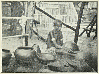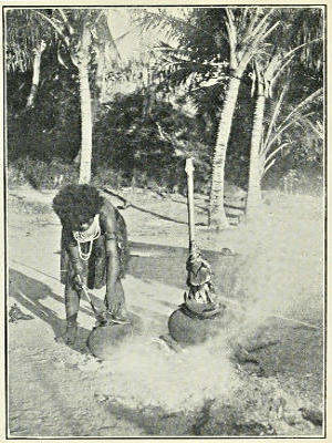 A piece of a particularly hard wood is cut and stood on end, and on top a few pieces of live charcoal are placed. With the help of the reed blow-pipe the charcoal is kept glowing, and the fire directed, while a shell of water is handy in case the burning proceeds more rapidly than is required in any one direction.