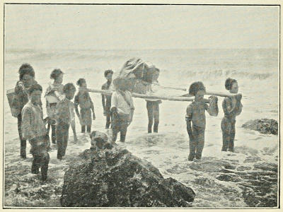 Partly walking through the stinking swamp and partly riding on the backs of well oiled natives we reached the boat, and began the homeward journey.