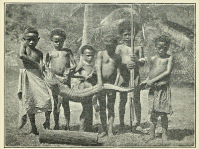 Crocodiles are too plentiful for comfort round Delena, and a long chapter could be written about the people they have carried off. One morning I saw a great brute snatch away two girls who were bathing in front of the Mission house, and though after a couple of hours chase the bodies were recovered, the crocodile got away. Later two of the Mission boys were fishing at night. There was a rush, a splash, and the one boy saw his companion snatched from the canoe by a crocodile.