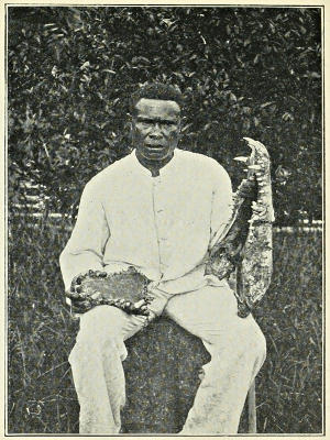 Ume Nou was at one time a teacher at Orokolo, but his wife died and he returned to his native village of Delena. When the picture was taken he had not turned scientist and found part of one of those wonderful creatures with the wonderful long name, that lived so long ago, but was holding the lower and part of the upper jaw of one of their relations.