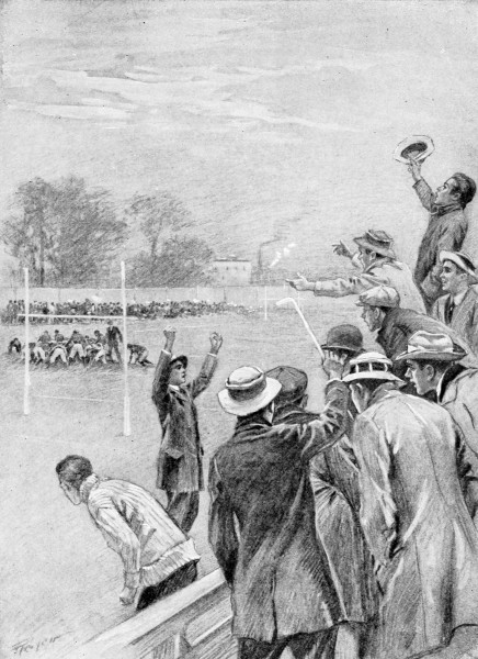 The Independents took up the march again, playing wide-open football and mingling line plunges with forward passes, delayed runs, fake kicks and other plays that made School’s head swim. It was brain against brawn now, and in the end brain won. Duffield had given his team plays that Hopkins had never thought of and hadn’t the slightest idea how to meet. The forward passes succeeded time after time, and when, down on the School Team’s thirty yards, Deering, standing back as though to try for a field-goal, passed the ball across to Rob and Rob threw it straight down the field into Powers’ waiting hands, there was no one near to stop the latter youth when he skipped nimbly over the goal-line and made the first and only score of the day.