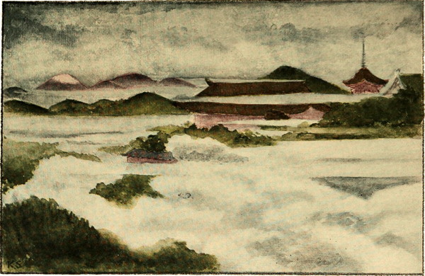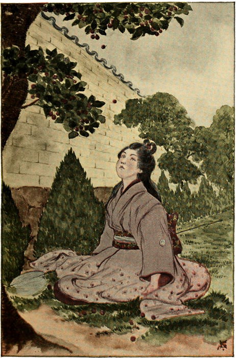 Fuji, the queenly mountain, wrapped about in its glorious garment of snow, mellowed by the touch of the sun, could be seen from her seat. On all sides of the palace grounds there were valleys and sloping hills. Within the stone walls which encircled the palace like a fortress there were gardens of wondrous beauty.