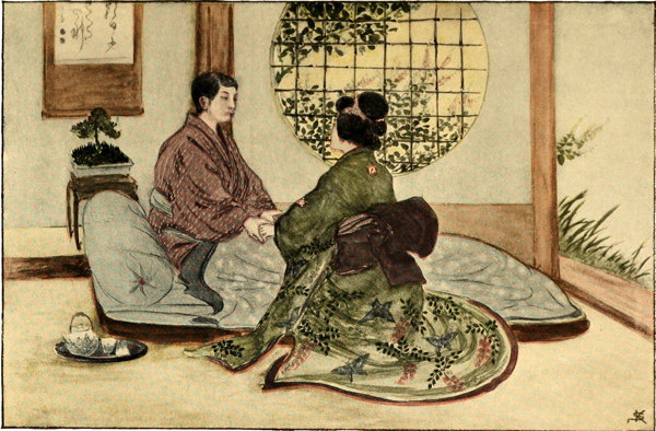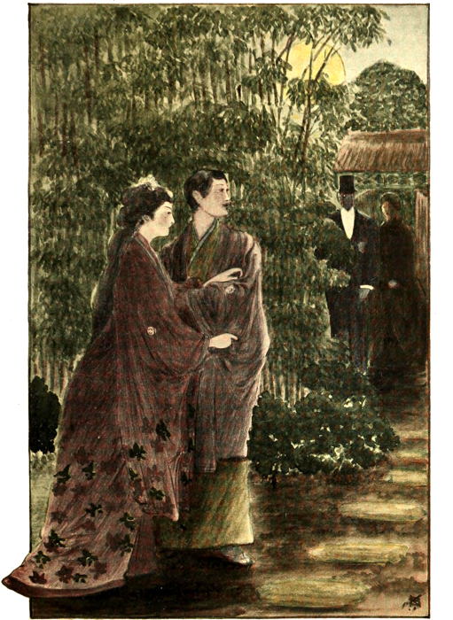 IT wanted but a few hours before the noon wedding when Sado-ko, appearing on her balcony, looked down into the garden, where her lover waited. Down the little flight of stairs straight to him she went, silently accepting from his hands flowers. Her eyes were fixed upon his face lovingly, but anxiously.