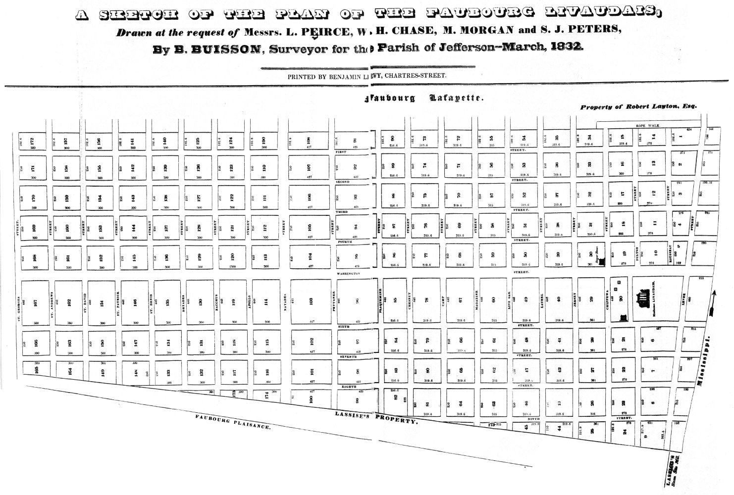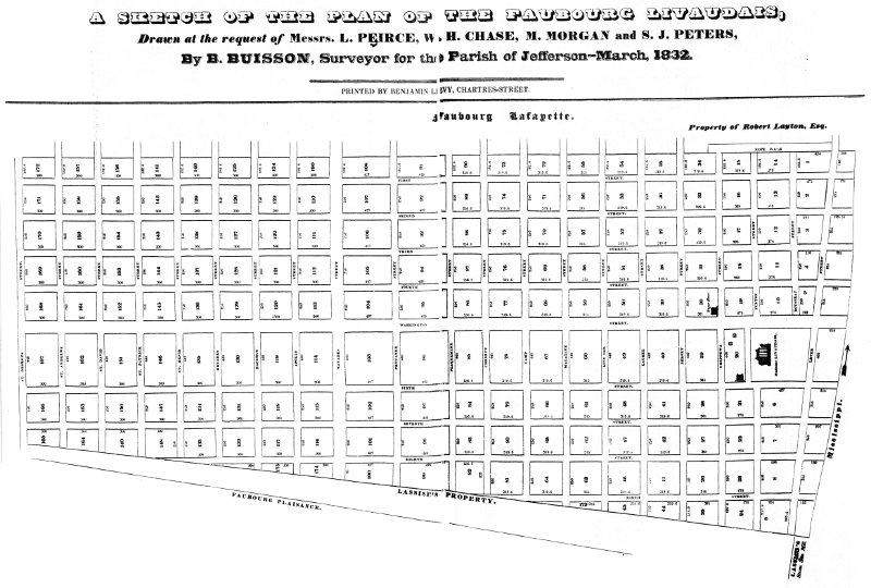 Perhaps the floodwaters dampened their ardor for a castle on the Mississippi to rival those of their ancestors in France. Perhaps it was something else. In 1825 the Livaudais were separated. In the settlement, Madame Livaudais received the plantation among other properties and funds. She moved to Paris, where as La Marquise de Livaudais she cut a wide swath, being among King Louis Philippe’s inner circle. Through her New Orleans attorneys she sold her plantation to a group of real estate entrepreneurs for $500,000. They engaged the eminent surveyor, Benjamin Buisson, formerly an engineer of Napoleon’s army, to lay out the plantation into streets and lots.