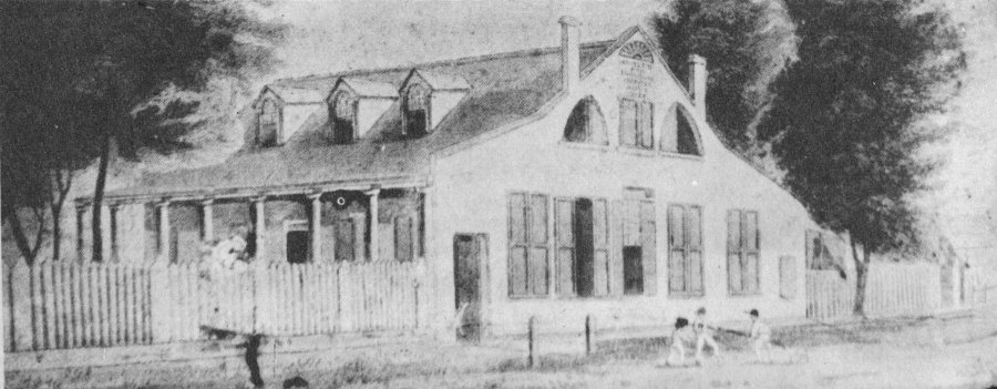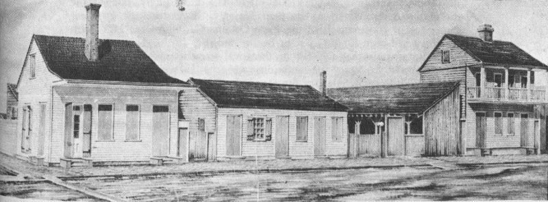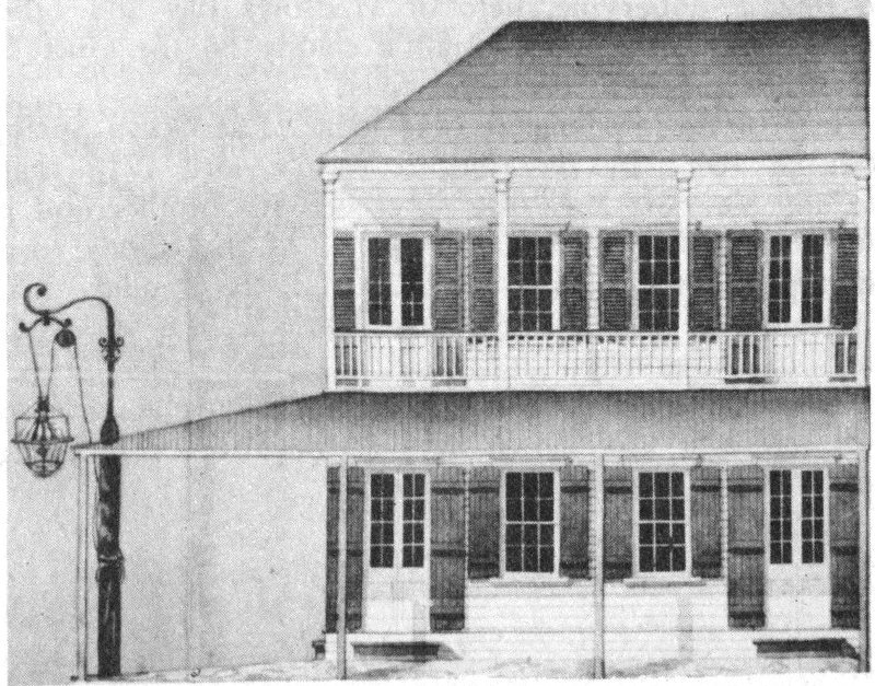 Old drawing in Archives of building at Third and Levee, probably a tavern. Lamp at corner was typical of those throughout Lafayette.