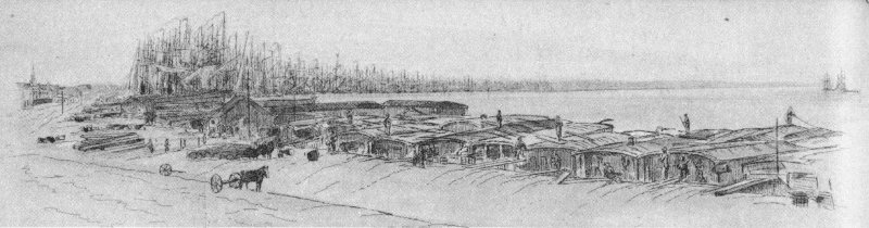 Flatboats lined riverfront in early days, awaiting sale of cargoes.