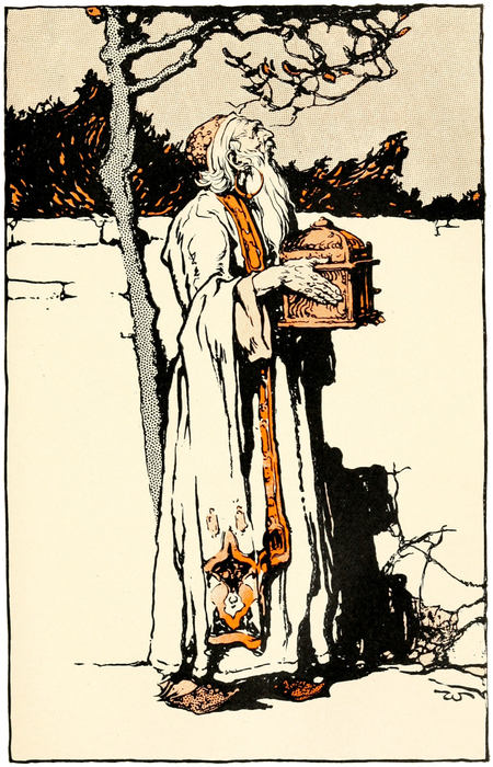 But you must hear how Jemshid looked to cause such a “Bah! Bah!” of approval. Well, to begin with, the great Shah wore many silken coats, one over the other, and a beautiful fur mantle outside all the rest. As for his gorgeously embroidered, baggy trousers, behold, they were tight at the ankles, while his slippers were of pure gold. Yes, and upon his head he wore an immense, many-colored turban, in the front of which blazed a huge diamond, set about with rubies and pearls. As for the rest, he was tall, and dark, and majestic, looking every inch a king.