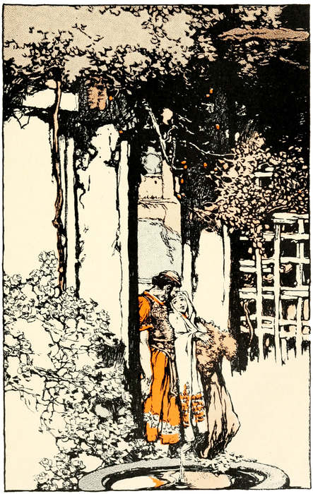 When the material for the stories was originally collected, the author’s idea was simply to work out for her own use in story-telling to children a picture presentation of a delightful series of tales little known to the young. Accordingly, like the fabled busy bee, she scrupled not to enter the most exclusive Persian gardens, dipping into the cup of each bright posy containing the least mite of the sweets for which she was delving—her desire being to give to this particular jar of honey not the Atkinson, or the Mohl, or the Arnold flavor alone, but a composite which should be all of these, and yet distinctly individual and unique, the point of view being not the usual one of the translator, the paraphraser, or the raconteur working upon the lines of the epitomist, but rather that of the moving picture artist and the story-teller combined.