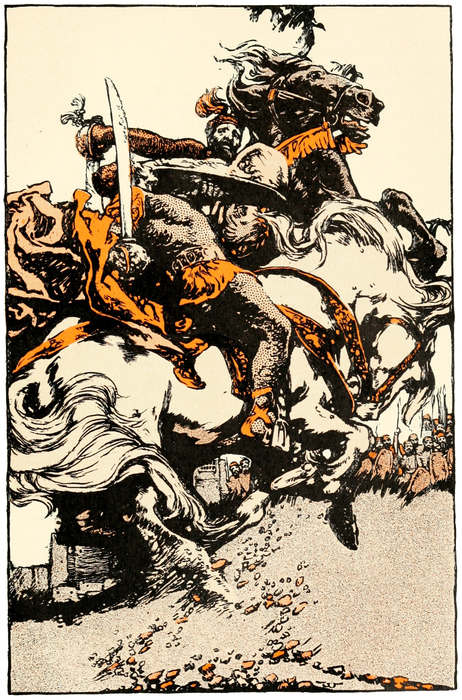 But behold! when sunshine once more flooded the world, then the Pehliva threw off his sadness, for he resolved once more to speak persuasive words unto the Prince. So, having received his father’s blessing, he armed himself for battle, and rode forth unto the tents of Isfendiyar, and lo! when he was come near, he shouted gaily: