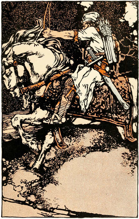 On the following day, therefore, the King directed the hunt unto the place in the forest where the pits were hidden. And behold! Shughad ran beside the horse of Rustem to show unto him the path. But when they were come unto the place of peril, Rakush, smelling the newly-turned earth, reared high in the air, refusing to advance. Then Rustem, thinking he was afraid, commanded him to go forward; but Rakush, backing, refused to give ear unto his master’s voice. Now this made Rustem angry so that lightly he struck him with his whip, though never before in all their long wanderings together had he done so. Then, alas! surprised and maddened by the stroke, Rakush sprang forward, but only to fall into one of the treacherous pits.