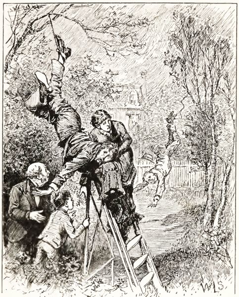 Mr. Travers had walked into a trap, and was swinging by one leg, with his head about six feet from the ground. Nobody knew him at first except me, for when a person is upside down he doesn't look natural; but I knew what was the matter, and told father that it would take two men to bend down the tree and get Mr. Travers loose. So they told me to run and get Mr. Schofield to come and help, and they got the step-ladder so that Sue could sit on the top of it and hold Mr. Travers's head.