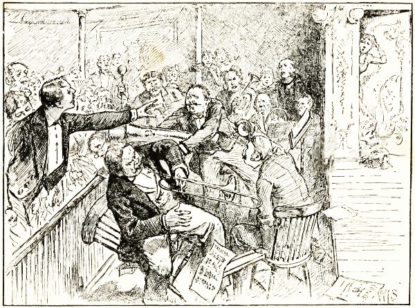 When things got a little bit quiet, and the man who played the drum had[Pg 45] made it up with the leader, the band began to play something on its own account. It began all right, but it didn't finish the way it was meant to finish. First one player and then another would blow a loud note in the wrong place, and the leader would hammer on his music-stand, and the people would laugh themselves 'most sick. After a while the band came to a place where the trombones seemed to get crazy, and the leader just jumped up and knocked the trombone-player down with a big horn that he snatched from another man. Then somebody hit the leader with a cornet and knocked him into the big drum, and there was the awfullest fight you ever saw till somebody turned out the gas.