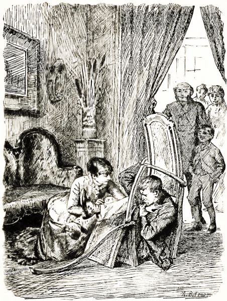 We had tried every plan we could think of to get Harry out of the[Pg 235] chimney, but none of them succeeded. Tom said that if we were to pour a whole lot of oil down the chimney it would make it so slippery that Harry would slide right down into the back parlor, but I wouldn't do it, because I knew the oil would spoil Harry's clothes, and that would make Aunt Eliza angry. All of a sudden I heard a carriage stop at our gate, and there were the grown folks, who had come home earlier than I had supposed they would. Tom said that he thought he would go home before his own folks began to get uneasy about him, so he went out of the back gate, and left me to explain things. They had to send for some men to come and cut a hole through the wall. But they got Harry out all safe; and after they found that he wasn't a bit hurt, instead of thanking me for all Tom and I had done for him, they seemed[Pg 236] to think that I deserved the worst punishment I ever had, and I got it.