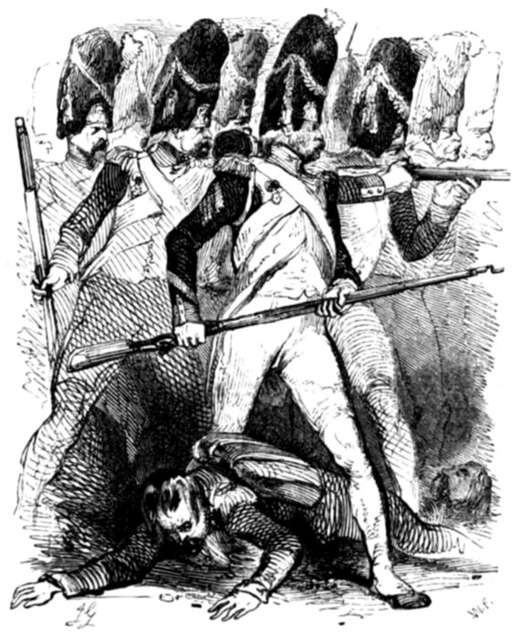 “Not exactly so. Many a brave man would in such a case have surrendered, and without dishonour too, but the colonel was too gallant an officer to think for a moment of such a course—whispering to his brigade-major to get as many men together as he could directly, he boldly rode up to the French commander and demanded his sword. The commander, not doubting but he was outnumbered, surrendered; and thus some half-dozen gallant Englishmen captured three hundred Frenchmen!”