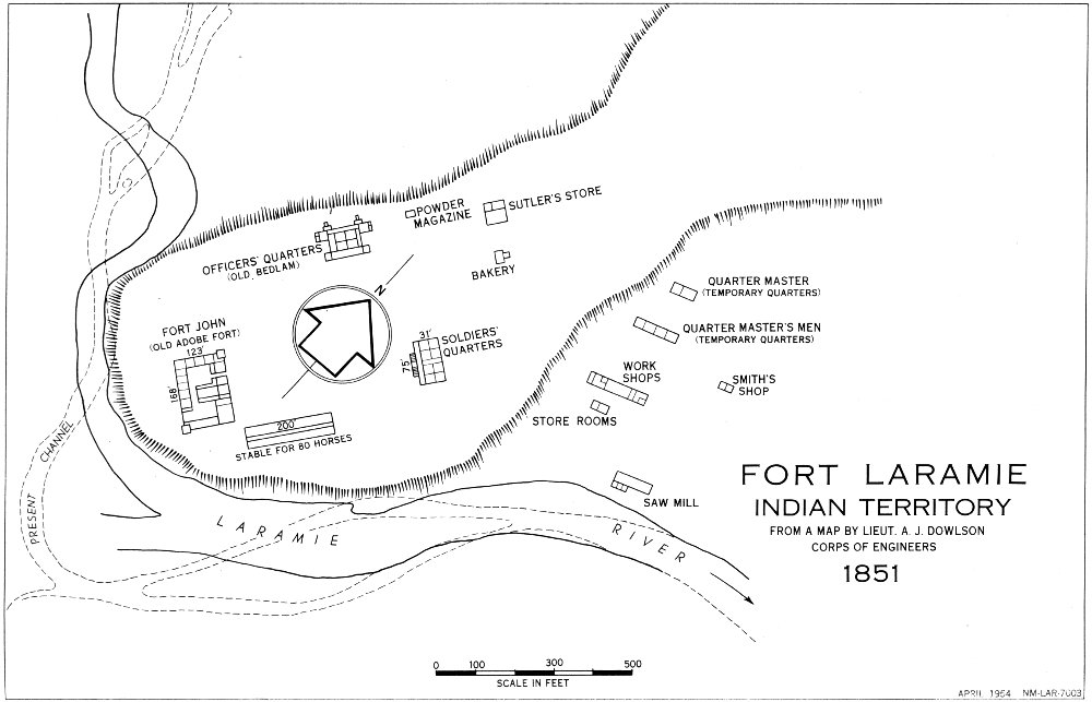 Major Sanderson with 4 officers and 58 men of Company E, Mounted Riflemen, left Fort Leavenworth early in May and arrived at the Laramie on June 16 without incident. On June 27 he wrote to the adjutant general reporting that after making a thorough reconnaissance of the neighborhood he had found this to be the most eligible site and that at his request Lieutenant Woodbury had, on June 26, purchased Fort Laramie from Bruce Husband, agent of the American Fur Co., for $4,000. He reported further that good pine timber, limestone, hay, and dry wood were readily available and that the Laramie River furnished abundant good water for the command.