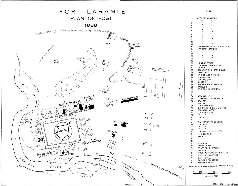 At Fort Laramie, the National Park Service is endeavoring to preserve the surviving features of the military period and, after exhaustive research, to restore standing buildings and related portions of the grounds to their appearance around 1888. Certain of the older structures provide glimpses of the fort scene as early as 1849.