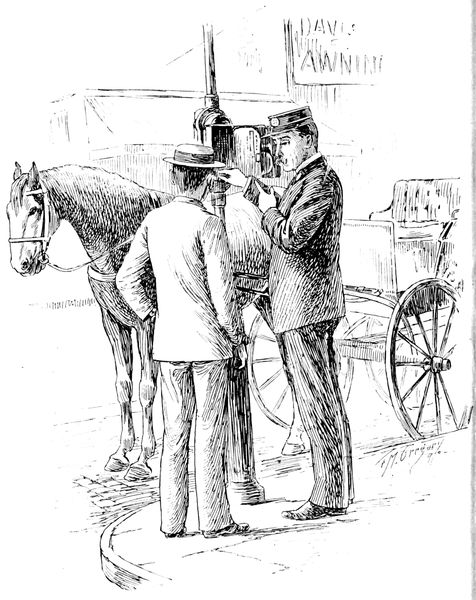 17“Remember this, my boy,” he said earnestly, “that promptness and readiness are the watchwords of the service. Every second of time is of importance, and you should never let another man get ahead of you when you are getting ready to go to a fire, nor allow another company to get a stream on the fire first, if you can possibly prevent it. The paid department was established in 1865. I don’t know how long it took an engine or truck to get out into the street then, but I do know that we have been lowering the record ever since, so that now the average time from the first stroke of the alarm until the engine, manned and ready for action, passes over the threshold is not more than ten seconds, and it has been done, of course only for exhibition purposes, in two seconds. Not a year goes by but sees some new invention or improvement to facilitate the work of the department, and my own opinion is that the rivalry between the different companies is the strongest incentive to efficient work there is. Now I’ll stop here and explain this fire box to you, so that you will be able to understand how these alarms come in.” With these words, the chief drew up in front of a lamp-post which was painted a bright red and had red glass in its lamp. To this was attached the fire box from which any citizen could send an alarm of fire.