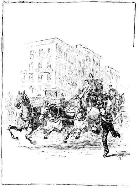 At this critical moment, and when the fire seemed to be making steady headway in spite of the desperate and diligent efforts of those who were fighting it, the sharp clang of a gong was heard on the street, and immediately the crowd which had gathered, despite the awful storm that was raging, parted in the middle. The policemen on guard saluted, and a wagon, drawn by a panting and sweating horse, dashed through the fire-lines and drew up suddenly at the curbstone. The tall, grizzled, and soldierly looking man who alighted was evidently a person of importance, for in an instant the deputy chief in command of operations appeared before him and saluted him in military style.