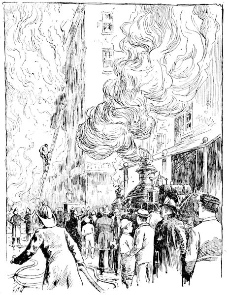 Then the reporter jumped back to the other side of the street, and, lifting his voice above the noises that filled the air, cried, “Stay where you are! he’s coming right up to you!” But even as he spoke the room in which the young girl stood was lit up with a flash of light, and then the smoke came in through the blazing door, and began to pour out of the window above her head in a dark, heavy stream.