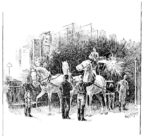 “Take up,” was the silent man’s rejoinder, and the wearied men gathered up their hose, placed it in well-ordered layers in the hose wagon, unblanketed the horses, and, carefully picking their way among the lengths of hose which were still lying on the ground, returned to their quarters.