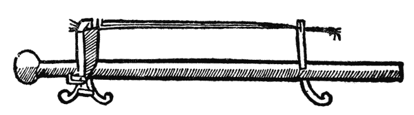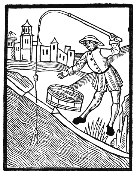 After the eloquent pleading for angling with which the treatise opens, the lady at once proceeds to teach the making of the “harnays” of it. The rod she orders to be constructed somewhat resembles, save in its larger size, the modern walking-stick rod. A hazel wand, or failing it, one of willow or mountain ash, is to be procured, as thick as the arm and nine feet in length. This is to form the butt, and is to be hollowed out by means of divers red-hot irons into a tapering hole, which is to receive the “croppe,” or top, as we now call it, when not in use. This “croppe” is to be made of a yard of hazel, joined to a length of blackthorn, crab, medlar, or “jenypre.” All these are to be cut between Michaelmas and Candlemas, the lady giving very particular directions as to their drying and the like. When the two portions of the “crop” are “fretted together,” the whole rod is to be shaved into a shapely taper form; the staff encircled with long hoops of iron or latten at both ends, and finished with a “pyke in the nether ende fastnyd wyth a rennynge vyce : to take in & oute youre croppe.” The line is then to be wound round the crop and tied fast with a bow at the top. The reader will note that there is no mention of a reel; it was only used, seemingly until the beginning of this century, for large salmon and pike. An angler who hooked a fish when armed with this ponderous rod (which must from its description have been nearly eighteen feet long, as large as a modern salmon rod), would act as Izaak Walton would have done in the like predicament,—throw the rod in to the fish and recover it when he could. But the lady is wonderfully pleased with this mighty rod, and thus concludes—“Thus shall ye make you a rodde soo preuy that ye maye walke therwyth : and there shall noo man wyte where abowte ye goo. It woll be lyghte & full nymbyll to fysshe wyth at your luste. And for the more redynesse loo here a fygure,” and she adds the curious woodcut which the reader may see reproduced at page 5.