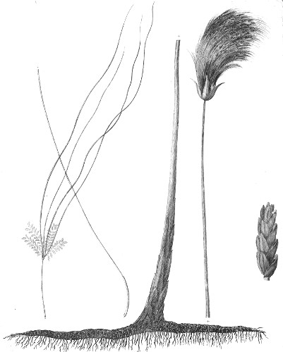 The ancients divided this plant into three parts, the head and the small part of the stalk were cut off, then the woody part, or bottom, and the root connected with it, and there remained the middle. All these had separate uses. Pliny8 says the upper part, which supported the large top itself, with the flowers upon it, was of no sort of use but to adorn the temples, and crown the statues of the gods; but it would seem that it was in use likewise for crowning men of merit. Plutarch9 says, that Agesilaus preferred being crowned with that to any other, on account of its simplicity, and that parting from the king he had sought to be crowned with this as a favour, which was granted him. Athenæus10, on the contrary, laughed at those that mixt roses in the crown of papyrus, and he says it is as ridiculous as mixing roses with a crown of garlic. The reason, however, he gives does not hold, for papyrus itself smells no more of mud, as he supposes, than a rose-bush; nay, the flower of the papyrus has something agreeable in its smell, though not so much so as roses. If he had said that the head of the papyrus 6 resembled withered grass or hay, and made a bad contrast with the richness and beauty of the rose, he had said well. But notwithstanding what Pliny has written, the head of the papyrus was employed, not only to make crowns for statues of the gods, but also to make cables for ships. We are told that Antigonus made use of nothing else for ropes and cables to his fleets, before the use of spartum, or bent-grass, was known, which, though very little better, still serves that purpose in small ships on the coast of Provence to this day. The top of the papyrus was likewise used for sewing and caulking the vessels, by forcing it into the seams, and afterwards covering it with pitch.