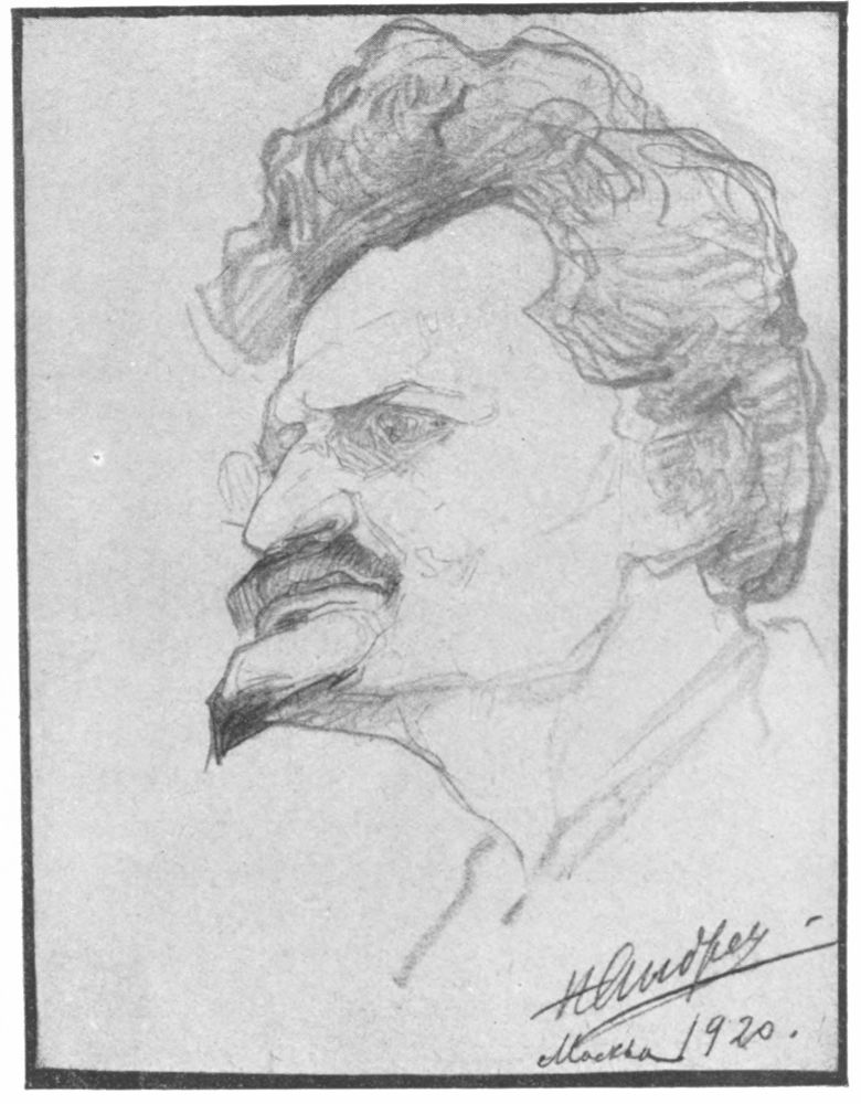 enemy Englishwoman.” He would not listen to any words of appreciation, he smiled in his genial, kindly way: “Of course we were glad to receive you, and to have you among us, une femme artiste, what did it matter to us, your nationality, or your relations. There is only one thing, que nous ne pouvons pas supporter,” and for the first time in all the months I have known him, a hard look passed over his face, and he set his teeth: “The only thing we cannot stand c’est l’espionage,” and the way he said it gave me a shiver down my spine. It was only a passing shadow, and the next moment he was telling me that he really regarded me as a woman of courage for coming just on his word, adding that when he saw me on the departure platform “with two small handbags, I knew in that moment that you were not any ordinary woman!” We looked back on our London days and laughingly discussed the first sitting when he invited me to come to Moscow. I told him “I did not believe that you were serious when you asked me,” and he said, “neither did I believe you were serious when you accepted.” He then proceeded to outline for me exactly what the effect of my Moscow visit would have on my friends, on my family, in the Press, and on my career. His accuracy remains to be seen.{186}