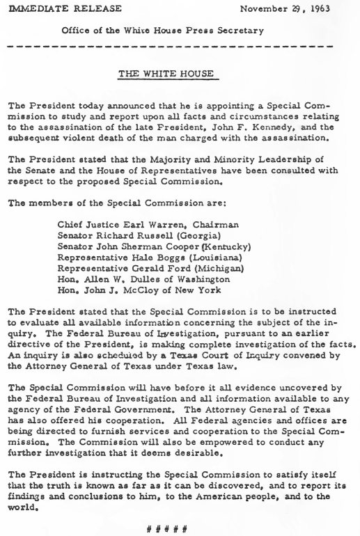 President Lyndon B. Johnson, by Executive Order No. 11130 dated November 29, 1963,F-1 created this Commission to investigate the assassination on November 22, 1963, of John Fitzgerald Kennedy, the 35th President of the United States. The President directed the Commission to evaluate all the facts and circumstances surrounding the assassination and the subsequent killing of the alleged assassin and to report its findings and conclusions to him.F-2