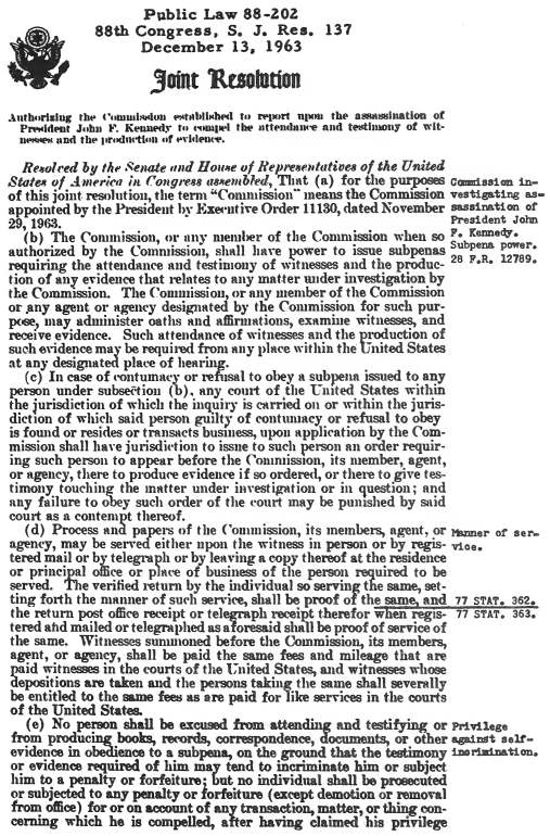 On December 13, 1963, Congress enacted Senate Joint Resolution 137 (Public Law 88-202)F-3 empowering the Commission to issue subpoenas requiring the testimony of witnesses and the production of evidence relating to any matter under its investigation. In addition, thexi resolution authorized the Commission to compel testimony from witnesses claiming the privilege against self-incrimination under the fifth amendment to the U.S. Constitution by providing for the grant of immunity to persons testifying under such compulsion. Immunity under these provisions was not granted to any witness during the Commission’s investigation.
