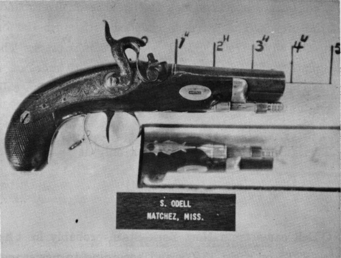 O’Dell came from New York State probably in the late 1830’s or early 1840’s and according to newspaper accounts of that period was murdered in the early 1860’s at Natchez. Although his derringers had bag shaped grips and not bird head grips, I am classifying them as a derringer rather than a pocket pistol. Halfstock rifles with his name are known.