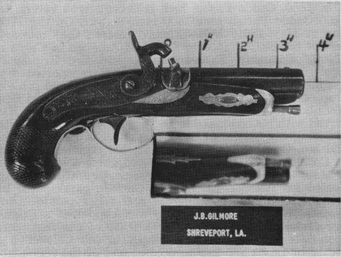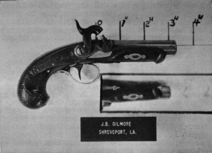 Jerome Bonaparte Gilmore was born in Jefferson County, Kentucky, in 1827, and came to Shreveport, La. in 1849. There is a strong possibility that he was the son of J. Gilmore, of the firm J. Gilmore and Moses Dickson, Gunmakers, of Louisville (1848-1860), as, according to the census of 1840, J. Gilmore, Sr. had a son of about this age. J. B. Gilmore worked for David Pobst, gunmaker, until about 1853 when young Gilmore went into the gun business for himself. The 1850 census lists both Pobst and Gilmore in the same recorders 54 visit which usually means that they were members of the same household, possibly roommates. Advertisements for both Pobst and Gilmore appear in the Caddo Gazette in 1853, and seem to indicate that they are competitors. An ad in the Caddo Gazette, 3 Feb., 1855 is as follows: