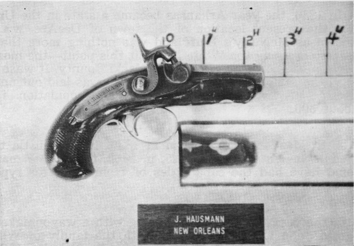 #242 J. Hausmann was an arms dealer before the Civil War in New Orleans. Little is known about him. Notice that this gun has definite Southern characteristics of some of the Memphis and Nashville guns in the screw plate under the forearm that holds the barrel to the forearm, the fluted nose of the forearm, and the full octagon barrel. All furniture is likewise plain as is characteristic of many of these guns. The grips are bird head shaped and are protected at the butt with a tear drop inlay. There is a screw through the trigger plate holding to the barrel. The caliber is .410.