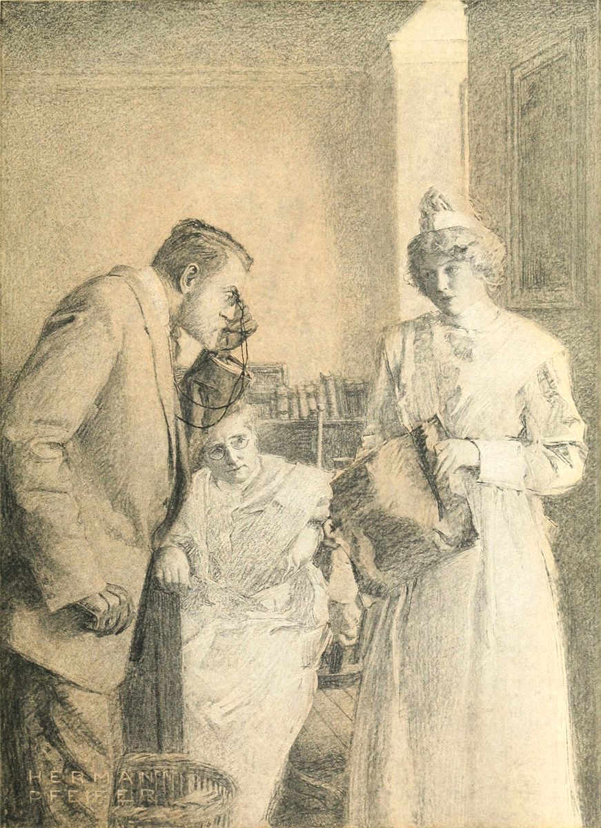 Once inside the house, the professor paused timidly in the hallway. Before him stood two doors. One was the entrance to the dining-room; the other led into the capacious living-room. The stairs were beyond, at the extreme back of the hall. Through the open doors of the living-room issued the sound of voices. Professor Jarvis recognized his wife’s and Mrs. Heath’s and—no, he was not quite sure about the other one. The conversation within continued.