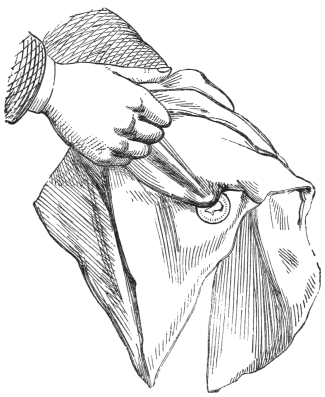IV. The Bleeding Thumb.—This is a very effective trick, but I am afraid, unless my pupil has some little self-sacrifice, and does not mind enduring a trifling pain in order to amuse his audience, this trick will never be performed. Previous to doing it, you puncture your thumb with a needle in one or two places, near the nail. You then assert that you will cut open your thumb and instantly heal it. You take a handkerchief and tightly bind the thumb therewith, keeping the thumb perfectly straight. You ask for a knife—the sharper the better—and, having obtained one, you pretend to cut the thumb, which you bend. This causes the blood to flow from the punctures. The blood spreads along the knife, which looks as though it had cut almost through the thumb. You then wipe the blood away, straightening the thumb, and show that there is no sign of wound or blood.