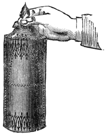 VIII. Carrying Fire in the Hands.—In performing this extremely simple trick, the audience must not be informed of what it is your intention to do, but it should be done when there is any delay in your other tricks, or some hitch occurs in getting anything you require, and which happens not to be at hand. For filling up a gap in a performance, it will be found extremely useful. In giving an entertainment of magic, always have on your table two burning candles; they are both useful and ornamental, and serve to dispel any idea of the spectators that you cannot perform your tricks in a full light. You go to the table, having previously concealed a piece of paper in your hand between the two middle fingers, and place your hands around the flame, saying it is perfectly possible to retain the heat in the hand, and even carry the flame from one candle to another. You then blow out one of the candles, and quickly place your hands round the other, set fire to the paper in your hand, blow out the candle, quickly light the first and then the second, smothering the flame of the paper in your hand. This trick, when well done, causes great astonishment and surprise.