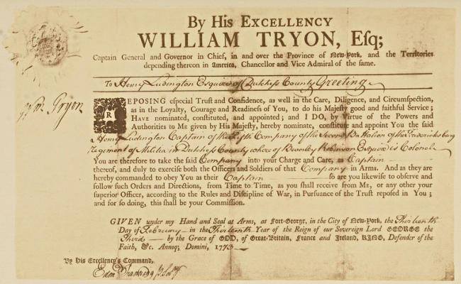 We, reposing especial Trust and Confidence, as well in your Patriotism, Conduct and Loyalty, as is your Valour and Readiness to do us good and faithful Service; HAVE appointed and constituted, and by these Presents, DO appoint and constitute you, the said Henry Ludinton, Junior,[205] Lieutenant of a Company in the Regiment of Militia in the County of Dutchess, whereof John Drake, Esquire, is Lieutenant-Colonel Commandant.