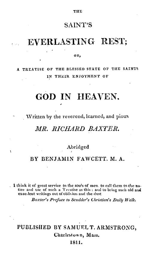 Heavenly rest is a subject, in its own nature so universally important and interesting, and at the same time so truly engaging and delightful, as sufficiently accounts for the great acceptance which this book has met with; and partly also for the uncommon blessing which has attended Mr. Baxter's manner of treating the subject, both from the pulpit, and the press. For where are the operations of Divine grace more reasonably to be expected, or where have they in fact been more frequently discerned, than in concurrence with the best adapted means? And should it appear, that persons of distinguishing judgment and piety, have expressly ascribed their first religious impressions to the hearing or reading the important sentiments contained in this book; or, after a long series of years, have found it, both the counterpart, and the improvement, of their own Divine life, will not this be thought a considerable recommendation of the book itself?