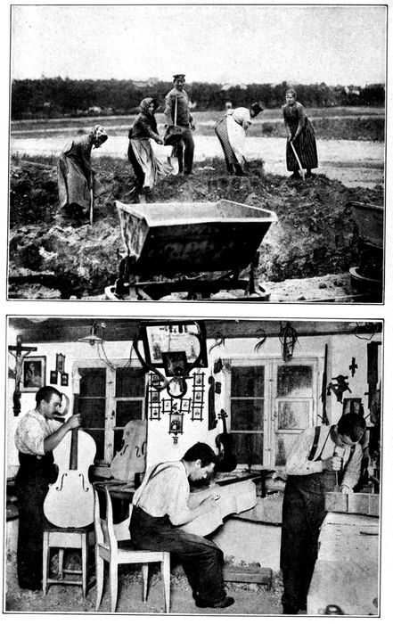 The thoroughness with which Germany utilized her 342man-power during the war was personified in this human pine-tree of the Weimar hills. He had been granted just two furloughs—of six and fourteen days, respectively. Both of them he had spent in his fields, laboring from dawn to dark, for, as he put it, “the women were never able to keep up with the crops.” His only grievance against fate, however, was the setback it had given the education of his children. Since 1914 his boys had received only four hours of schooling a week—as to the girls he said nothing, as if they did not matter. The teachers had all gone to war; the village pastor had done his best to take the place of six of them. Women, he admitted, might have made tolerable substitutes, but in Germany that was not the custom and they had never been prepared to teach. The optimistic American attitude of overlooking the lack of specific preparation when occasion demanded has no champions in the Fatherland, where professions, as well as trades, are taken with racial seriousness. The end of the war, he complained, with the only suggestion of bitterness he displayed during a long evening, had found him with a son “going on twelve” who could barely spell out the simplest words and could not reckon up the cost of a few mugs of beer without using his fingers.