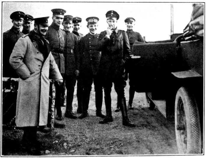 The price was high, but it would have been several times more so for those unable to buy their marks at the foreign rate of exchange. A swift military automobile called for me at the hotel next morning, picking up a captain in mufti next door, who welcomed me in a manner befitting the ostensible fatness of my purse. On the way to the flying-field, several miles out, we gathered two youthful lieutenants in civilian garb and slouchy caps, commonplace in appearance as professional truck-drivers. The captain introduced me to them, emphasizing my nationality, and stating that they were the pilot and pathfinder, respectively, who were to accompany me on my journey. They raised their caps and bowed ceremoniously. The pilot had taken part in seven raids on Paris and four on London, but the biplane that was already fanning the air in its eagerness to be off had seen service only on the eastern front. It still bore all the military markings and a dozen patched bullet-holes 346in wings and tail. The captain turned me over to a middle-aged woman in an anteroom of the hangar, who tucked me solicitously into a flying-suit, that service being included in the price of the trip.
