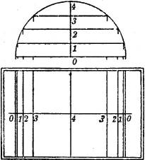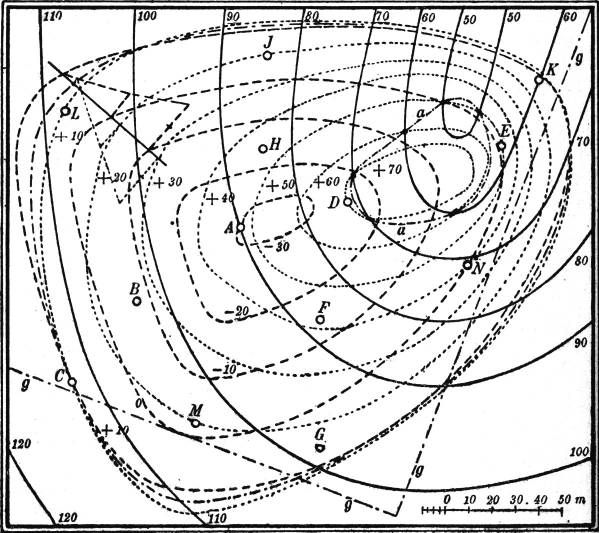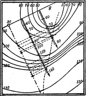 Die Brauchbarkeit und Anschaulichkeit der Darstellung einer Geländefläche durch eine Karte gewinnt erheblich, wenn auf ihr eine genügende Anzahl von Höhenlinien der Art verzeichnet ist, daß ihnen eine Einteilung der Fläche in Schichten gleicher Dicke entspricht (Schichtenplan). Auf dieser Darstellung einer Geländefläche durch ihre Schichtlinien beruht[2] die Möglichkeit, auf zeichnerisch-konstruktiven Wegen eine große Anzahl von Fragen und Aufgaben zu beantworten, wie sie in der Vermessungskunde, Kartenkunde, Geographie, militärischen Topographie, Bauingenieurwissenschaft, Geologie, Bergbaukunde usw. vorkommen können. Die Ausführung der Methoden, die zur zeichnerischen Lösung solcher Fragen dienen, bildet ein wichtiges Mittel der angewandten Geometrie, das sich aus praktischen Bedürfnissen heraus, ursprünglich nautischen und militärischen, entwickelt hat, zuerst in Frankreich, wo die Kenntnis derartiger Dinge noch bis vor hundert Jahren militärisch geheim gehalten wurde.